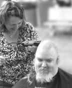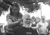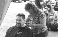 Pat Gagne of Elite Hair Salon in St. Albans buzzed or shaved 8 men and women throughout the day: Anne Harper, Dick Harper, Hayes Johnson, Ed Jones, Scott Martin, Steven Martin, Richard Menard, and Karl Schraut. She shaved Dick Harper. Jones, and Schraut, Every participant received a ball cap from the cap sponsors.